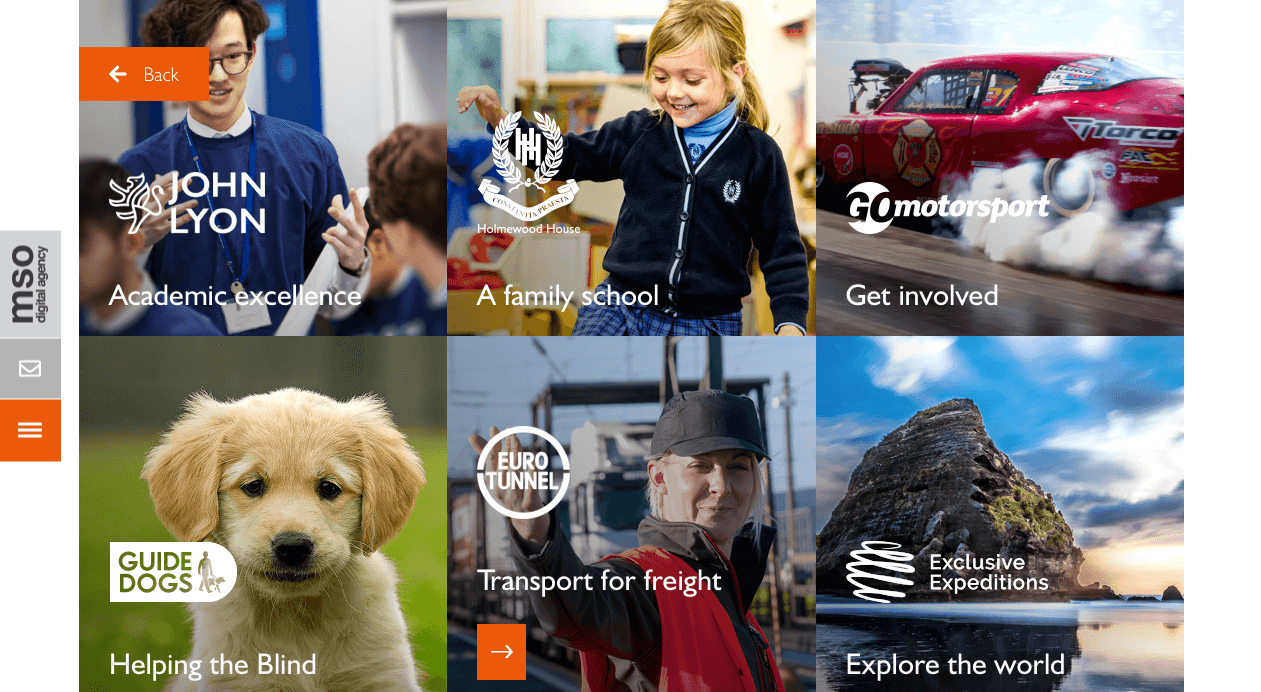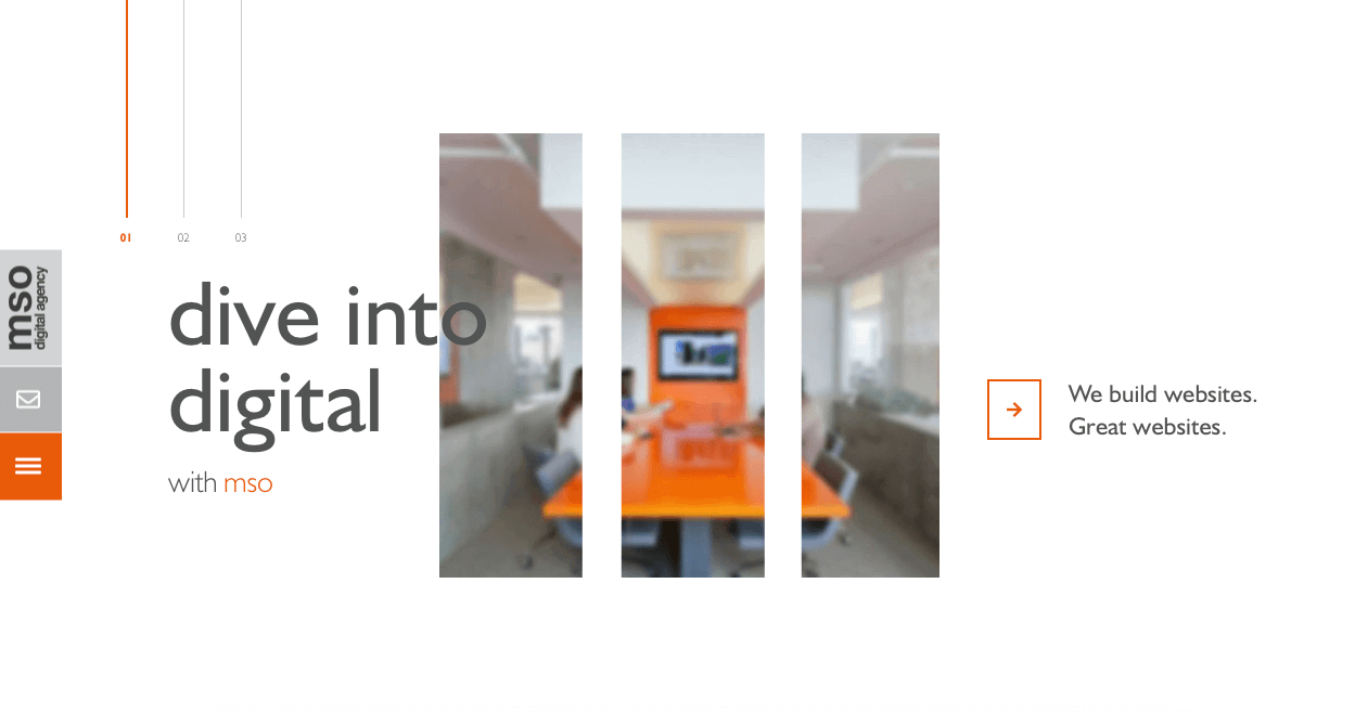 Starting with the homepage. Our old homepage was bright, colourful and full of images, we really wanted to keep things simple and concise with this new site. We have designed and created a minimalistic homepage with three simple sliders, these take you down to a client list component, then our footer. Using powerful imagery on the three homepage sliders was key to draw the users attention, each image is overlaid with a cut out of an abstract letter from ‘mso’. The three sliders introduce us at mso, as well as showing off two of our amazing clients. With subtle animation adding to the interest of the page we think this is a great introduction to the website.