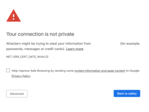 An SSL certificate can be easily installed on your website to protect details such as credit card numbers, names and addresses from hackers (so make sure you have one). It is a type of digital certificate that provides authentication for a website and enables an encrypted connection. In the past, SSL certificates were quite costly to install on websites but nowadays with systems such as Lets Encrypt they are basically free! Without one, search engines will warn users that your site is not secure (see image below).
