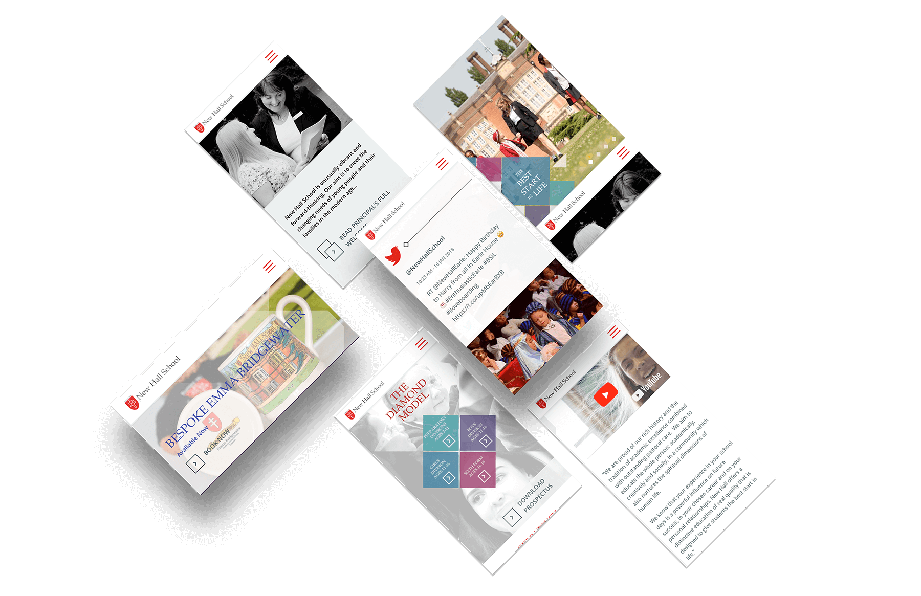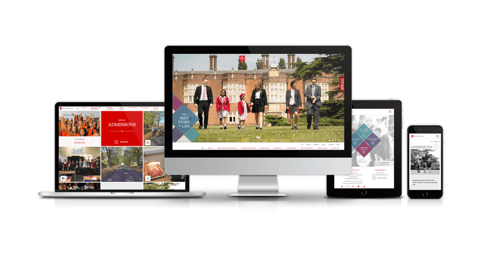 New Hall have a strong brand image which we wanted to incorporate into their new website. One of the main aims when designing and creating the site was to incorporate the use of the diamond shape from their brand guidelines to reflect the school’s diamond model pupil journey. We have incorporated this into the design whilst creating a visually stunning and functional website that exceeded the exception of the client. New Hall’s site is made up of a series of components which can be edited in the WordPress CMS by their own staff members.