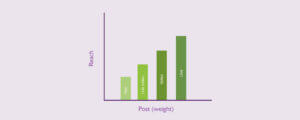 The ‘weight’ of your post is another factor the Facebook algorithm looks for, in order to determine the number of people your post will reach. Zoe explained this using a bar chart which I have recreated below. Weight + Affinity = Engagement